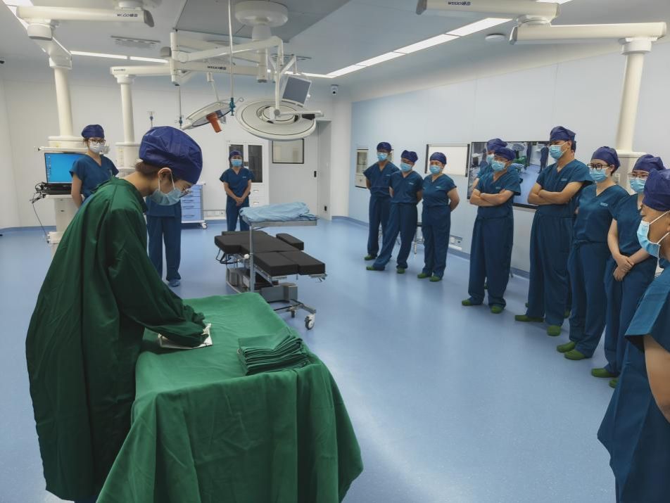 培训前期,医务部与护理部、手术室充分结合医院手术科室发展实际及临床需求,经过多轮研讨制定了科学详尽的培训方案。培训内容涵盖外科手消毒(免刷手消毒、刷手消毒)、穿、脱无菌手术衣、无接触式戴无菌手套、手术区皮肤消毒注意事项、标准手术铺单,形成 “理论 + 实操 ”的培训模式,确保培训实效。