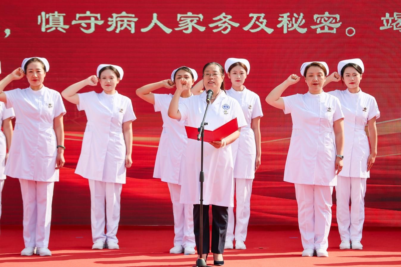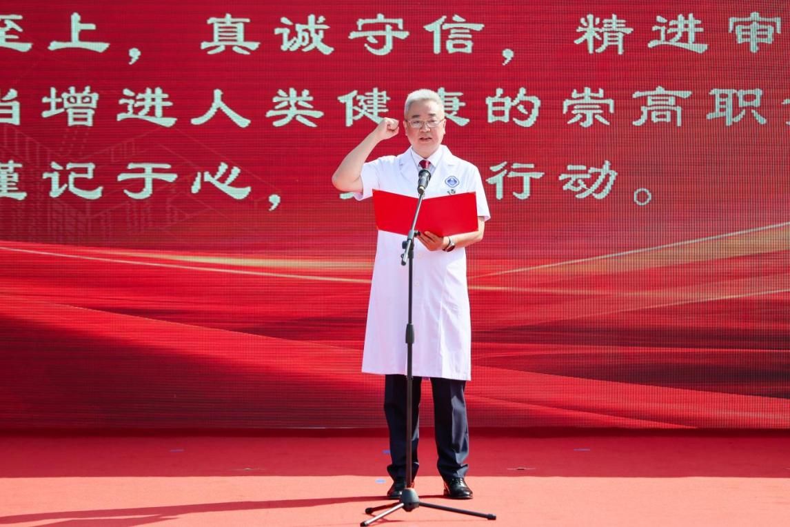 随后,在净月院区副院长罗云纲的带领下,全体医师高举右拳,庄严宣誓,重温医者初心。
